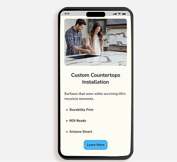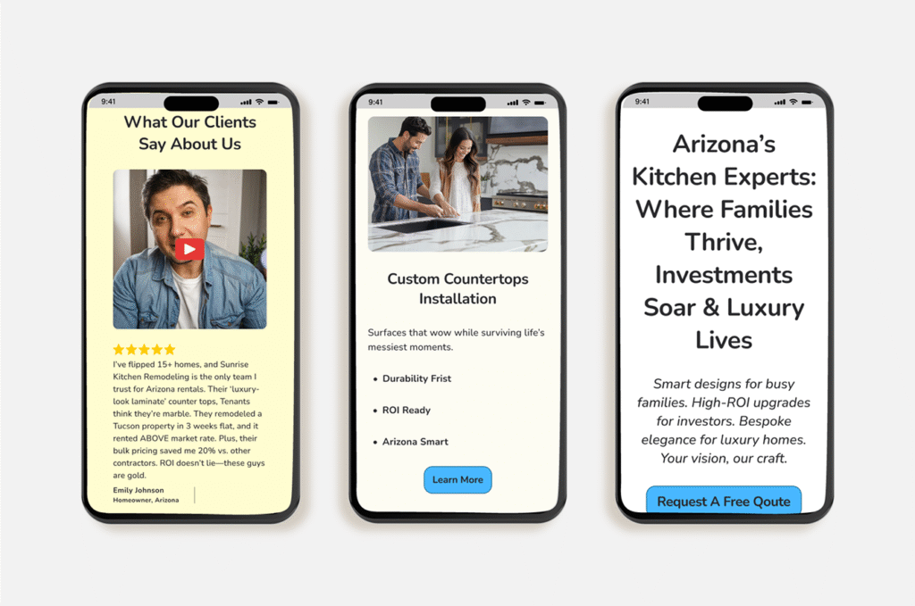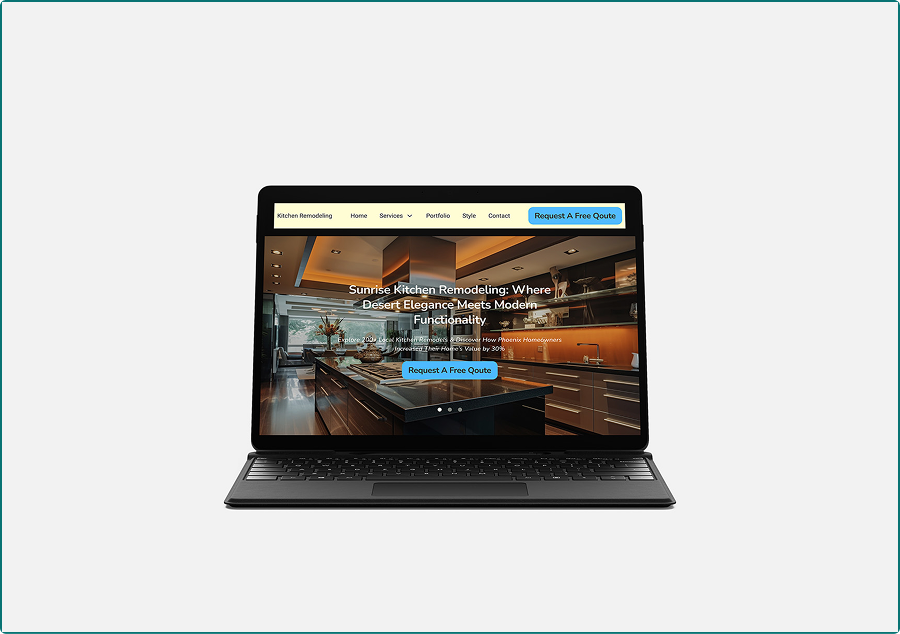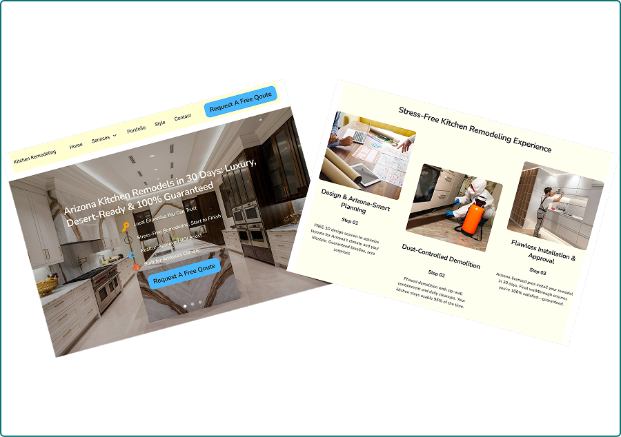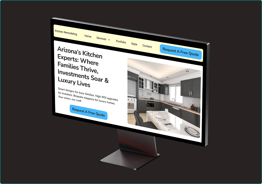 A concept project luxury kitchen remodeling site for Arizona contractor. High-end aesthetic fused with conversion-driven UX—visual portfolio, services showcase, and CTAs optimized for mobile/local SEO.